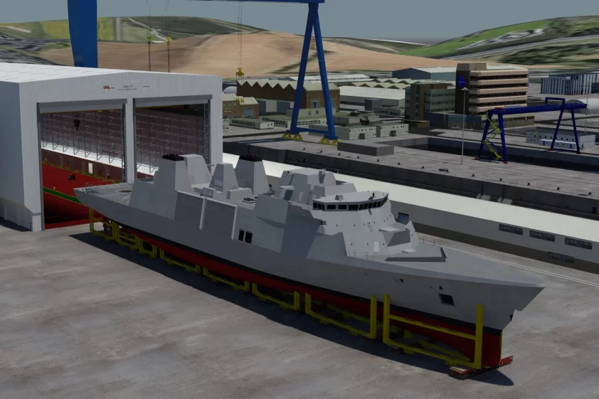 HMS Venturer, primera fragata Type 31 de la Royal Navy, en las instalaciones de Rosyth. Firma Babcock