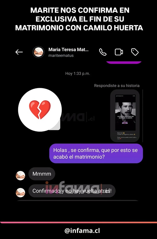22/07/2025Marité Matus anuncia la disolución de su matrimonio con Camilo Huerta y afirma que no hay posibilidad de reconciliación.byeditor