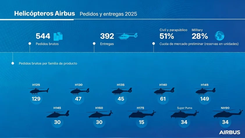 Airbus Helicopters finalizó 2025 con 536 solicitudes netas, en comparación con las 448 de 2024. De estos, un 28% fueron para programas militares, cuatro puntos más que el año pasado. En términos de volumen, la cartera de defensa aumentó un 40%, pasando de aproximadamente 108 helicópteros en 2024 a cerca de 150 en 2025, un crecimiento impulsado por contratos gubernamentales en Europa y el norte de África.