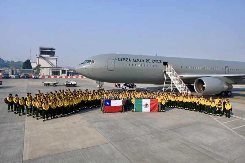 Un avión de transporte Boeing 767-300ER del Grupo de Aviación N° 10 de la II Brigada Aérea de la Fuerza Aérea de Chile (FACh) transportó a un contingente de 145 brigadistas mexicanos al aeropuerto Carriel Sur de Concepción, quienes apoyarán en la extinción de focos activos de incendios forestales que, desde el 17 de enero, han impactado gravemente a la zona centro-sur del país.