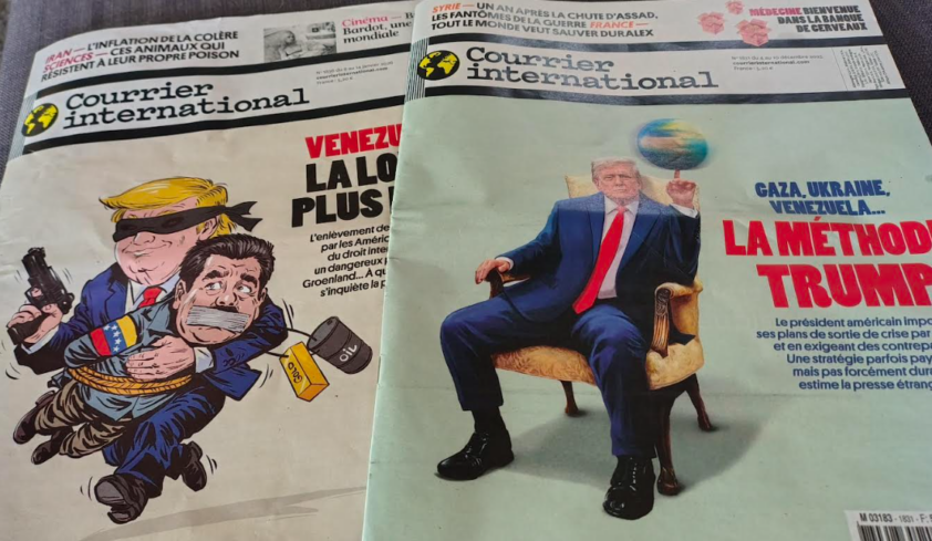 El semanario francés «Courrier International» ha dedicado ediciones especiales al secuestro del presidente de Venezuela y su posterior detención en EE.UU. Con el título «La loi du plus fort» (La ley del más fuerte), su portada presenta a Trump como un pistolero cargando al presidente Maduro. En el artículo «Trump sur tous les fronts» (Trump en todos los frentes), se le muestra con un pie en EE.UU. y otro en América Latina, mientras en la portada se le ve sosteniendo el mundo en sus manos.