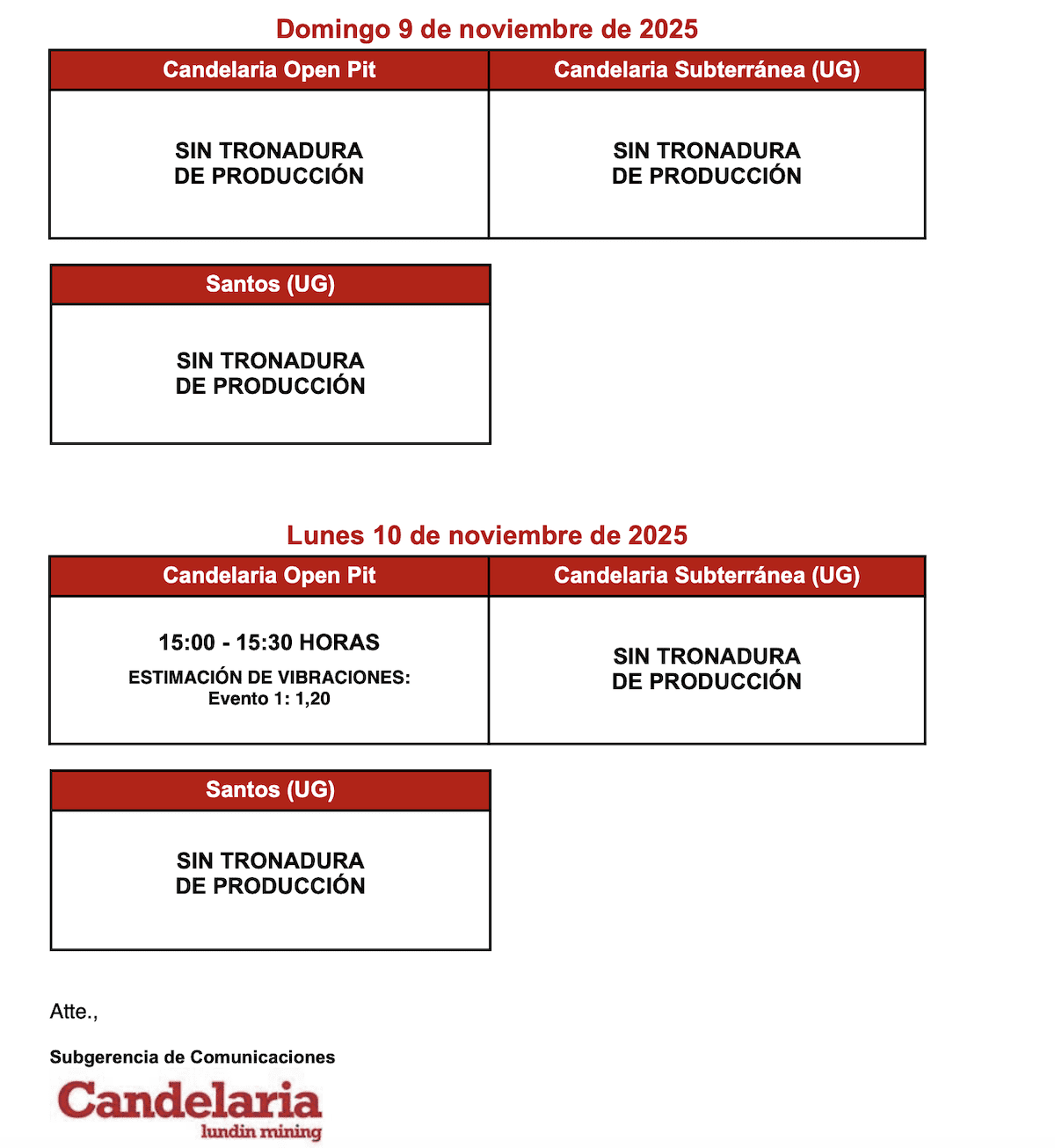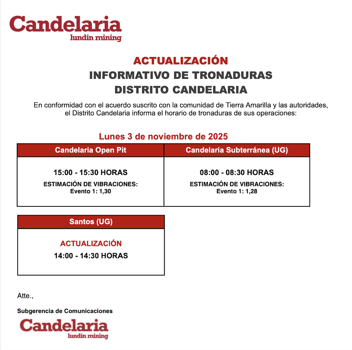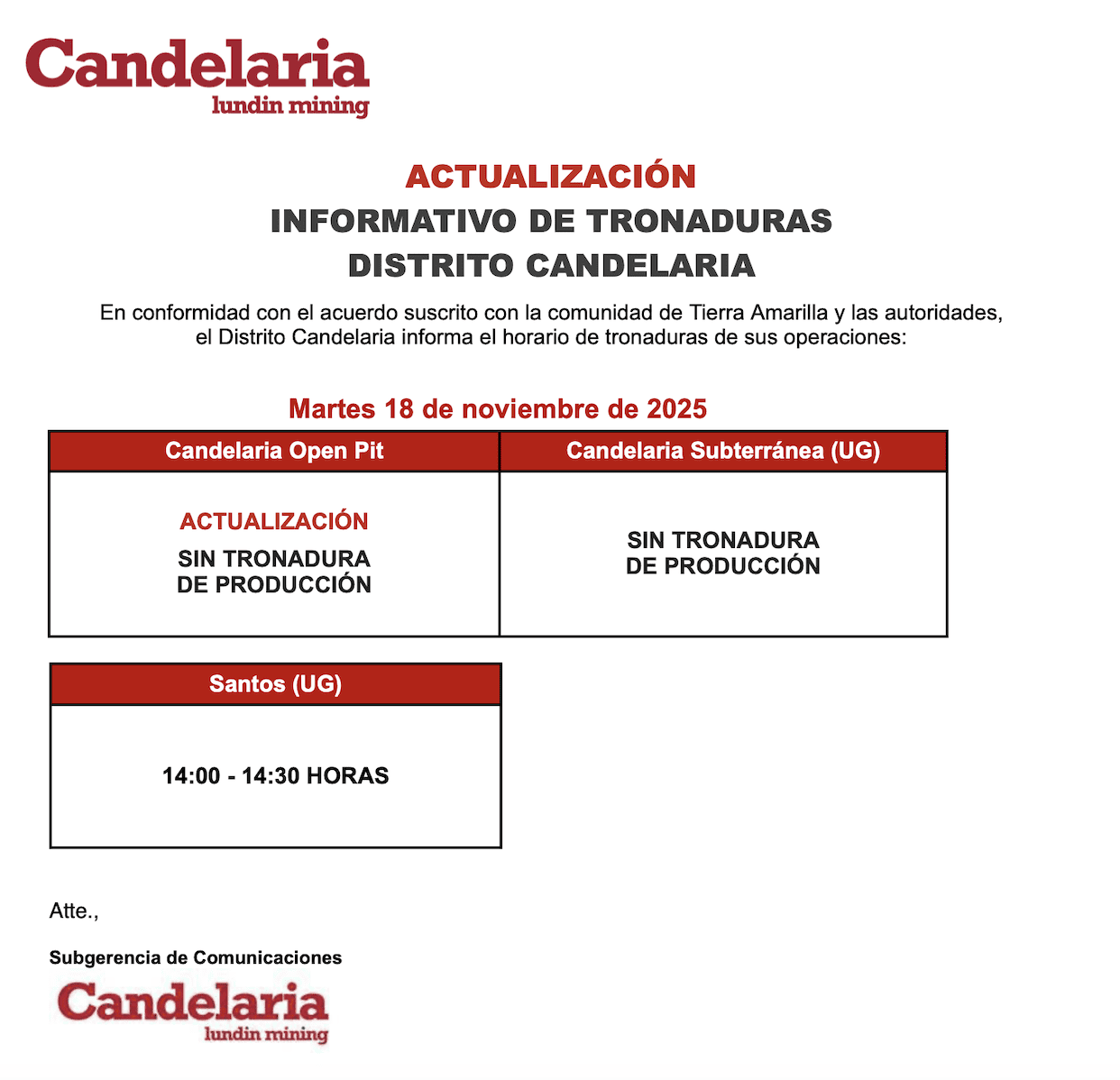 03/11/2025ACTUALIZACIÓN SOBRE TRONADURAS EN EL DISTRITO CANDELARIA / LUNES 3 DE NOVIEMBRE DE 2025byeditor